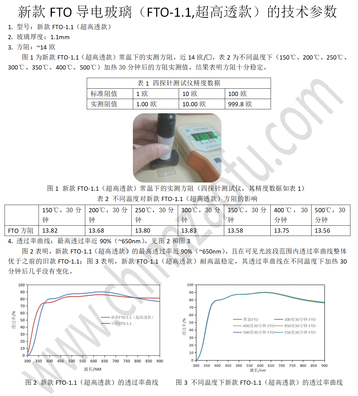 1. 新款超高透FTO-1.1mm的主要技术参数:新款超高透FTO(1.1mm,14欧);