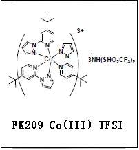 FK209钴基(III)双三氟甲烷磺酰亚胺盐用于钙钛矿太阳能电池HTM层的P型掺杂剂, 可有效地提高电池的开路电压, 短路电流和填充因子, 从而大大提高电池的光电转换效率.